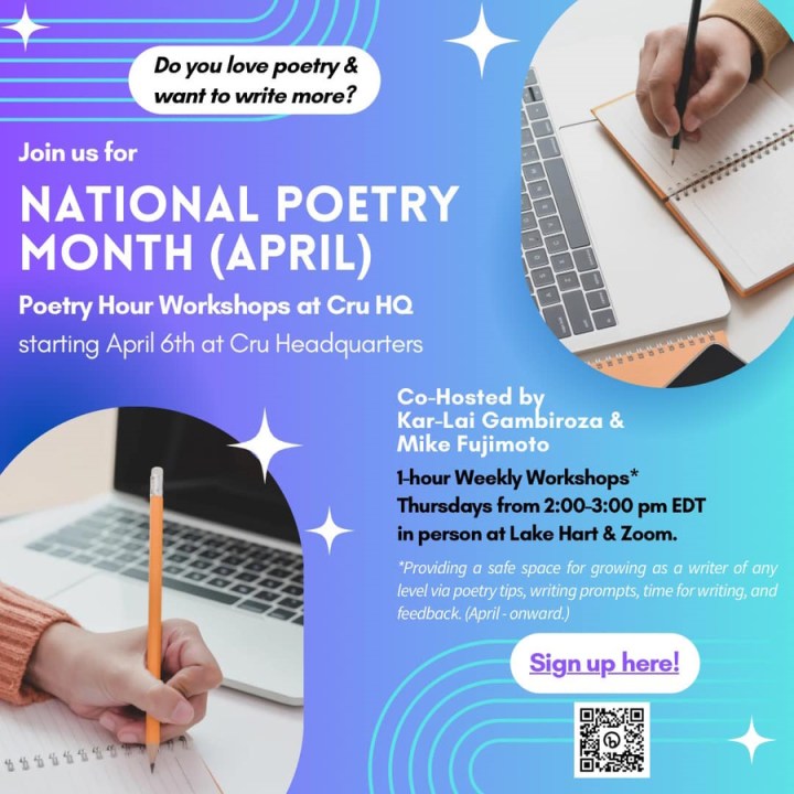 Do you want to start or grow as a poet and to have a safe space to be encouraged, get tips, practice writing, share, and get feedback on your poetry? Join poets and spoken word artists, Mike Fujimoto and Kar-Lai Gambiroza, this April on Thursdays from 2:00 to 3:00 p.m. EDT. The Poetry Hour Workshops meet at Lake Hart and/or Zoom. The kick-off is on April 6th.