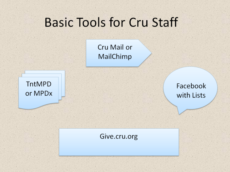 The “can you be more social” slide is for those of you that have a website instead of just the give.cru.org site. I’m talking about a website that doesn’t have a blog feature in it. Maybe you’ve had a website for years. What you’re probably doing is: you update your website and then maybe you’re sending an eMail about the update on your website (maybe even a PDF attachment) and if you’re really on top of things, you’re posting about your update in social media as well.