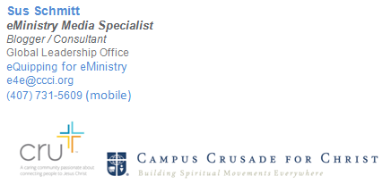 Thank you for helping make this service possible for even more Campus Crusade for Christ staff. I’m grateful for the many volunteers who’ve assisted me with blog posts and various learning opportunities and events.